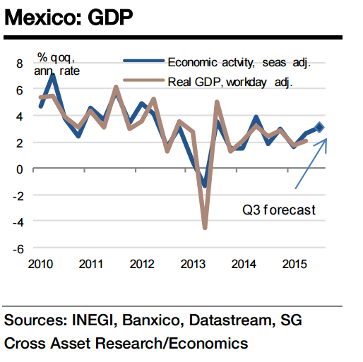Mexico's economic activity has, in fact, surprised to upside in recent months considering the extent of slowdown in industrial production (particularly in the mining sector). The trade and IP numbers put supply-side growth at close to 2.8% yoy in September. As a result, Q3 supply-side growth is estimated at 2.5% yoy (0.8% qoq or a 3.1% qoq annualised rate compared with 2.5% in Q2 and the current forecast of 2.5% for Q3).