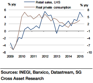 Despite Mexico's growth weakness in H1 and the visible effect of the slowdown in the labour market, retail sales on average have continued to trend up this year, in part due to the low base effect in H1 2014 and partly due to lower inflation this year.