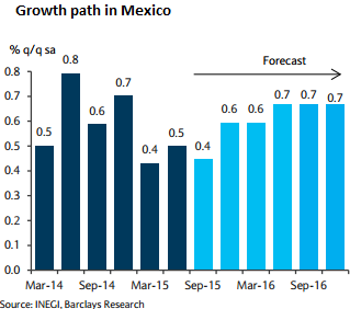 Mexico's economy likely to face headwinds in the second half of the year as the global growth is experiencing downward risk. With the suspection of risk from external factor, the economy is likely to expand by 2.2% y/y in 2015 and 2.4% y/y in 2016 (from 2.6% and 3.1) on the back of a softer growth path, estimates Barclays. Although the services sector has been growing at a solid pace, this was likely driven by electoral spending in H1 15. Accordingly, the bank expects a deceleration of this sector in H2 as this one-off positive effect fades.