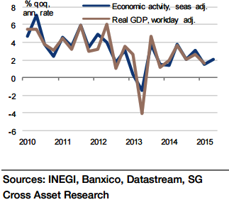 "Improvement in IP growth through the remainder of this year should help the economy grow to its potential in H2 15 and then to strengthen in 2016. Currently, the Mexican economy is expected to grow by 2.6% (with considerable downside risk as discussed above) in 2015 and 3.2% in 2016", added Societe Generale.