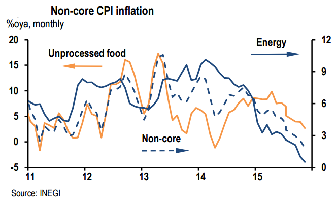 The sources of the moderation in inflation were generally in line with the view, although the adjustment was clearly sharper than anticipated. Over the five years through 2014 regulated gasoline prices had increased around 10% per year. This trend changed in 2015, when the government committed to increase prices by no more than 3%. Persistent oil price declines, however, led to an even slower rise in gasoline prices, which look set to increase by just 2% this year. Additionally, the government announced a reduction in electricity tariffs early in the year. Together, these factors pushed down energy price inflation to multi-year lows.