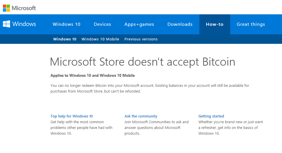 Tech giant Microsoft has announced that its online store is longer accepting Bitcoin as a payment method and that this applies to Windows 10 and Windows 10 Mobile.