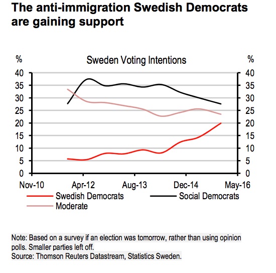 Figure from HSBC, sourcing Thomson Reuters DataStream displays result of the poll, what would happen if election is held tomorrow. However, Sweden is not going into elections until 2018, however figure clearly shows support for ruling social democrats has been declining steadily.