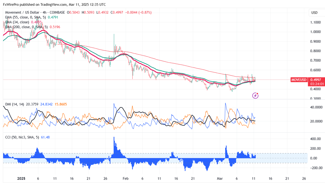 MOVEUSD is consolidating after a minor pullback. Any daily close above $2 confirms further bullishness. The pair holds above the short-term (34 and 55 EMA) and long-term moving averages on the 4-hour chart. It hit a low of $0.4410 yesterday and is currently trading around $0.50. The bullish invalidation can happen if the pair closes below $0.30 On the lower side, the near-term support is $0.44; any close below will target $0.37/$0.30. The pair's near-term resistance is around $0.5500, and any breach above confirms minor bullishness. A jump to $0.60/$1/$1.50/1.50/1.75/$1.90 is possible. A surge past $2 will take it to 2.50/2.50/3.