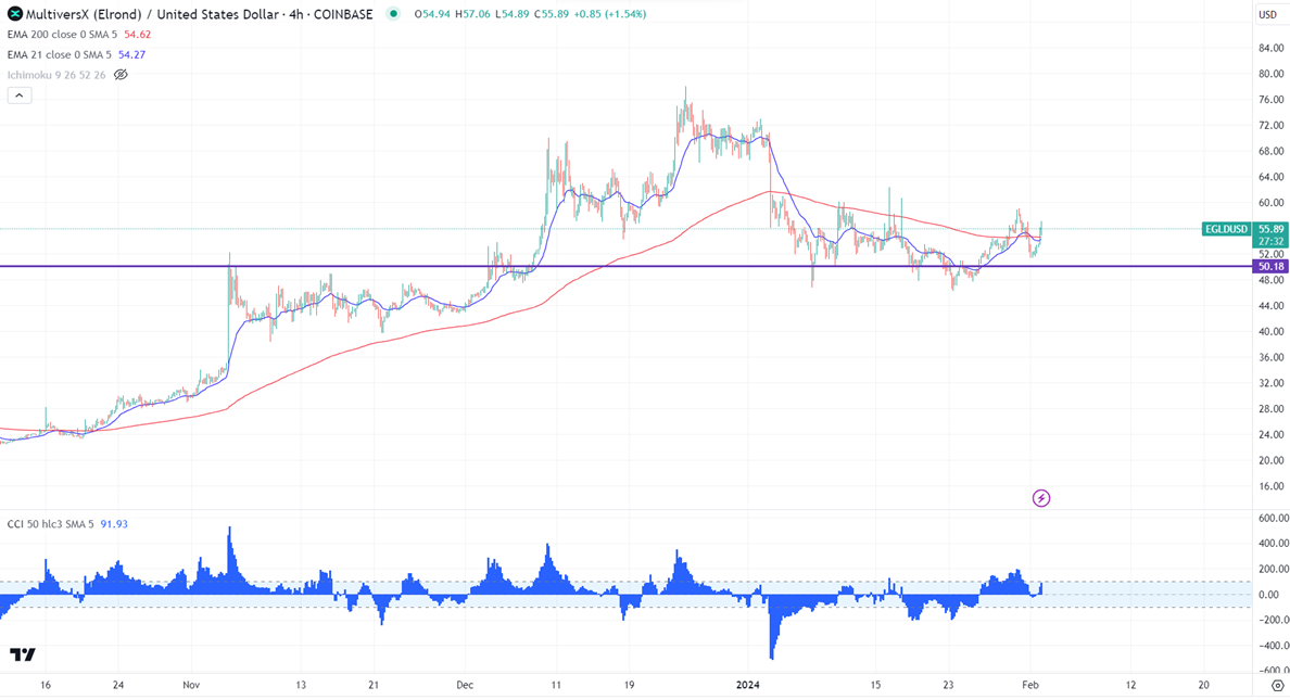 EGLDUSD gained more than 10% in the past two days. The pair holds well above the short-term (21 and 55 EMA) and long-term moving average. It hit a high of $57.05 and is currently trading around $55.85.