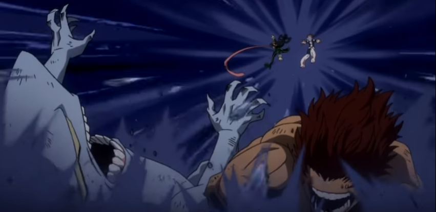 The three characters then do their best to fight, with Bakugou using the explosion from the vehicle to bounce back and save Natsuo. Midoriya, on the other hand, uses his smash powers to create an explosion. Thanks to Endeavor’s teachings, Midoriya makes use of the black whip quirk thong to bring the vehicle back to the ground.