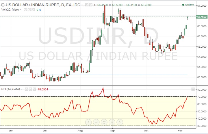 Taking from the spot market, after payroll data INR was down 37 paisa against Dollar and closed at 66.13 per Dollar. After Bihar election over the weekend, INR opened down another 37 paisa at 66.5 per Dollar.