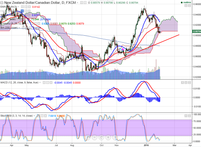 - NZD/CAD has broken major support 0.9050 and declined till 0.9037. It is currently trading around 0.9070.
