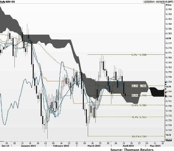 Underlying trend is bearish and the offer is placed at the cloud top at 0.7534 Break of cloud base opens up 61.8% Fibonacci at 0.7385 of the 0.7197/0.7698 rise