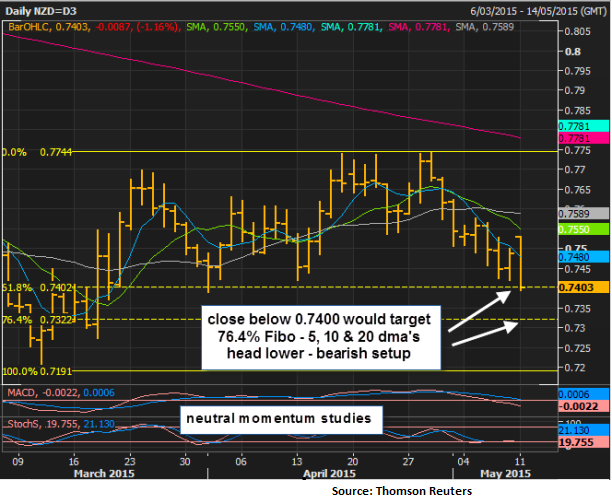 Some bank analysts made dovish RBNZ rate revisions Swaps now price a July 25pt cut @ 46% from 28% NZD now stalled around 0.7402, 61.8% of March/April rise