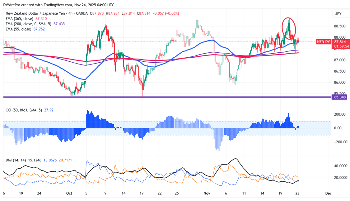 NZDJPY found support near the 365 4H EMA and exhibited a minor pullback. The intraday trend is bullish as long as support at 87.20 holds. The pair hit a low of 87.31 yesterday; it now trades at about 87.864.