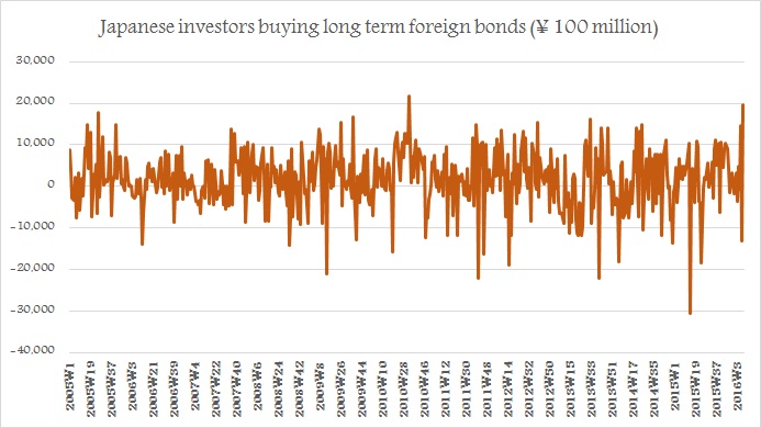 Now another trend is emerging. Japanese investors are being scared of negative rates. Japanese investors according to latest data available for January bough foreign long term debt securities at fastest pace since 2010. In 3rd week of January, investors bought net ¥1.97 trillion worth of foreign long term bonds.