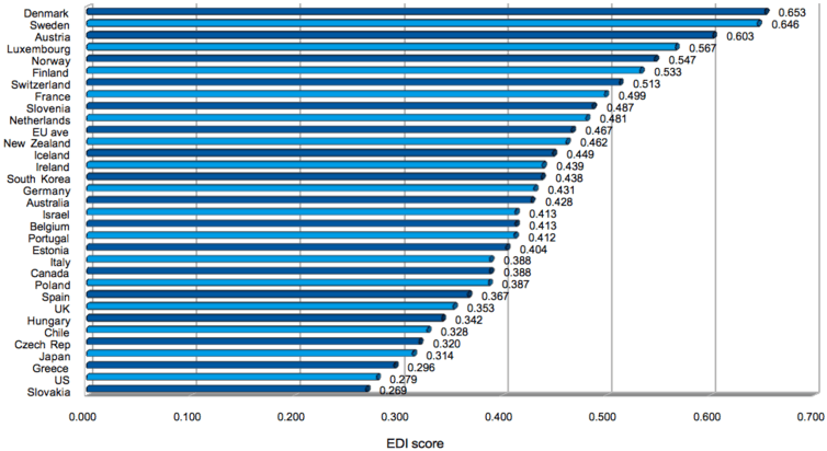 One other notable disparity in the index is between the scores of Austria and Germany, despite their relatively similar economic governance. Germany’s lower ranking reflects the growth of labour market insecurity and lower levels of job protection, particularly for part-time workers as part of the Hartz IV labour market reforms in the 1990s that followed reunification.