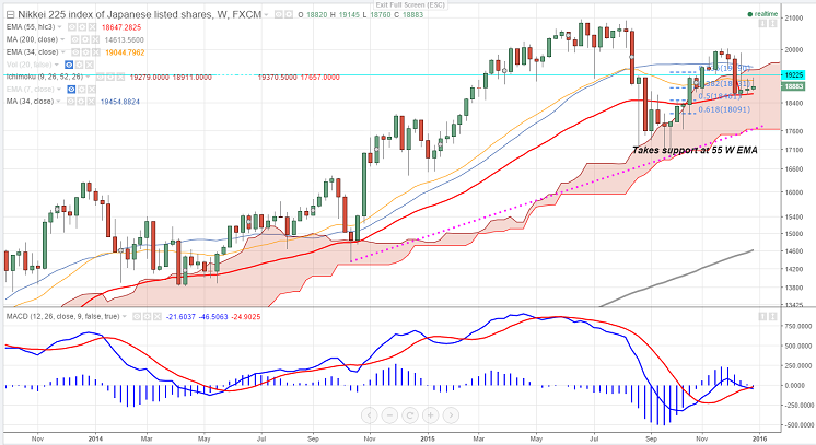 - Nikkei is trading in narrow range around 20000 and 18531 in the Dec month. the index has taken support near 18600 (55 W EMA) and slightly recovered from that level.
