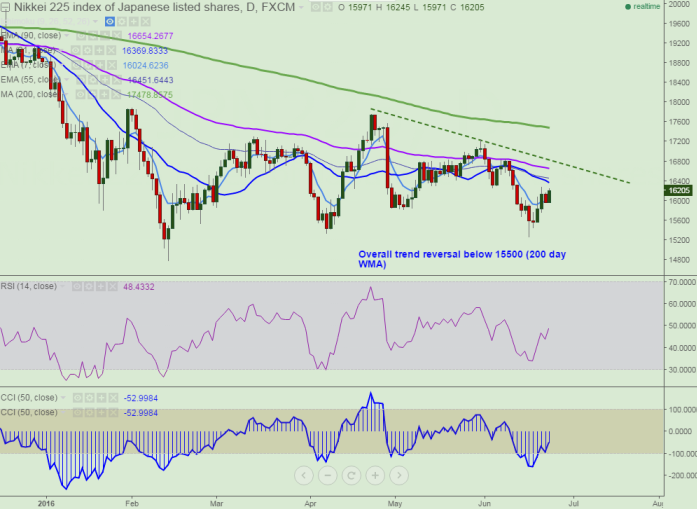 - The index is trading well above 16000 on hopes that UK will stay in EU. It is currently trading at 16205.Short term trend is slightly bullish as long as support 15500 (200 W MA) holds.