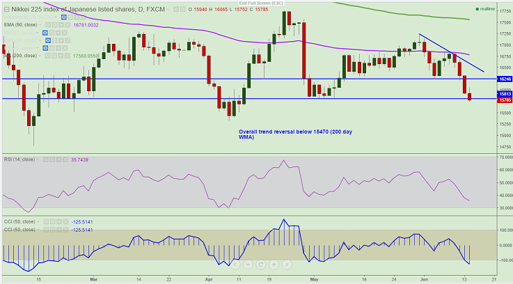 - Nikkei Index has broken major support 15800 ad declined till 15752 at the time of writing on account of Brexit and Fed policy meeting. It is currently around 15780.