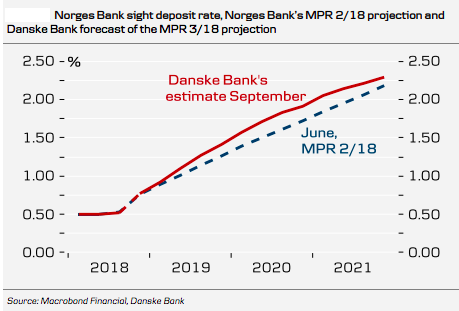 The Norges Bank is expected to raise the sight deposit rate by 25 basis points to 0.75 percent at its monetary policy meeting scheduled to be held on September 20 by 08:00GMT, according to the latest research report from Danske Bank. In addition, the revision of the rate path in the corresponding monetary policy report is likely to be positive, as almost all factors affecting the rate path should be supportive.