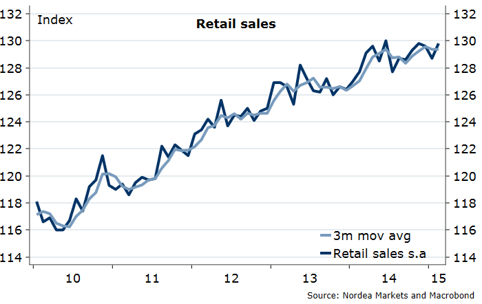 Retail sales dropped by 0,7% in January, but the drop is reversed with today's strong figure. Is does however not change the fact that the trend in retail sales is weak, pointing only slightly upwards. The figure is however somewhat reassuring. So far it seems like consumption is not slowing significantly after the drop in oil prices and cool down in the oil industry. The developments stand in contrast to consumer confidence figures which have fallen back to 2009 levels.