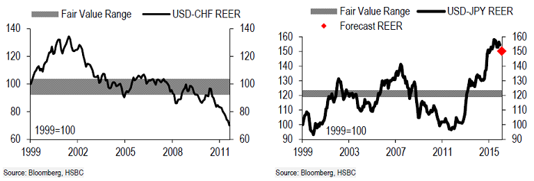 Is FX intervention by BoJ justified? The BoJ may argue FX intervention is justified in the same way that the SNB justified putting in a floor on EUR-CHF given the drivers of the current JPY surge. But the argument does not hold when we look at valuations. When the SNB implemented the EUR-CHF floor in late 2011, the CHF appeared to be significantly overvalued. On the other hand JPY is notably undervalued relative to the USD. This makes FX intervention harder to justify. Nevertheless, the fact that intervention may be harder to justify does not rule it out.