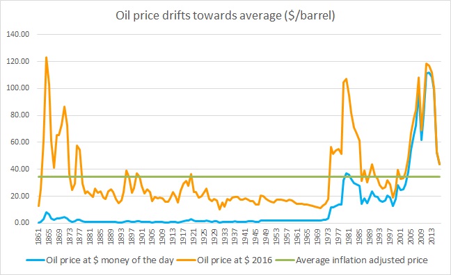 The price of oil is in recovery mode this week, after five weeks of consecutive decline. The North American benchmark WTI is currently trading at 445 per barrel and the North Sea benchmark Brent at $2.5 per barrel premium to WTI. However, we believe that the price would remain under pressure thanks to the existing supply glut in the market. This chart, which includes 255 years of oil price, especially since the days of the initial discoveries suggest that despite the above $100 price in recent years, the average price (adjusted to dollar money of 2016) remains low around $34.6 per barrel and the price might be drifting there.