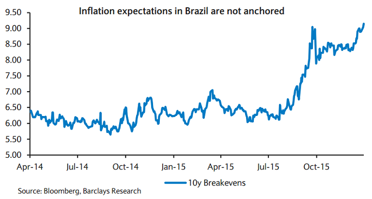 "Although analysts acknowledge the dilemma that the central bank faces, given the de-anchoring of inflation expectations, we do not think that it will be able to deliver as many hikes as currently priced in the DI curve", adds Barclays.