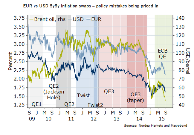 "China and EM fears is currently triggering massive de-risking in global markets, leading to a substantial squeeze higher in EUR/USD. Inflation markets are currently screaming for both ECB and Fed to ease further. To us it makes sense for the ECB to "outdove" the Fed, but that depends on how much the central bank has changed under Draghi," Nordea Bank said in a report to its clients.