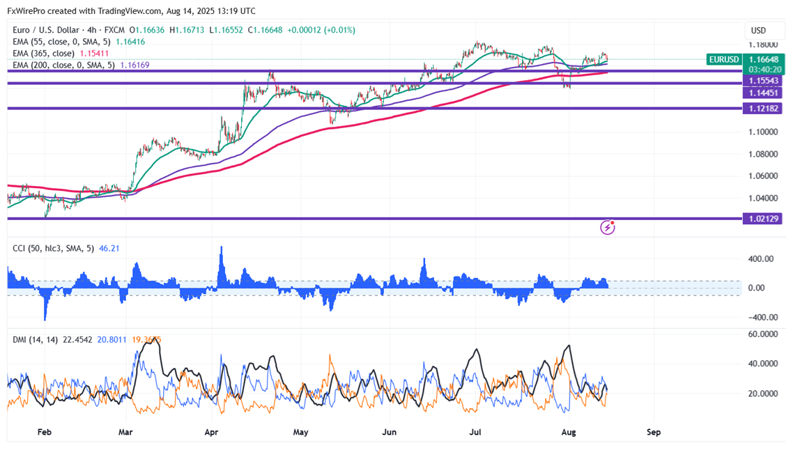 The pair is holding above the 55 EMA, 200 EMA, and 365 EMA in the 4-hour chart. Near-term resistance is seen at 1.1700; a break above this may push the pair to targets of 1.1735/1.1765/1.1800/1.1835/1.1900. On the downside, support is seen at 1.16450; any violation below will drag the pair to 1.1600/1.1545/1.1480/1.1435.