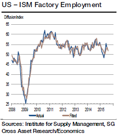 The currently available quartet of district U.S. Federal Reserve Bank surveys and Markit Economics canvass of 600 companies nationwide suggest that the ISM Purchasing Managers' Index slipped to a four-month low of 51.8 in August. The index would be below the 53.0 May-July average and consistent with annualized real GDP growth in the neighborhood of 2.9%, says Societe Generale in a report to its clinte.