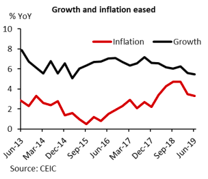 Moreover, the substitution effect between pork and other types of protein should soften the impact to overall CPI. External headwinds to trade have caused growth to slow. Growth disappointed in 2Q recording 5.5 percent from consensus estimate of 5.9 percent, the weakest in 17 quarters, the report added.