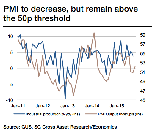 Poland's industrial output growth is expected to have decreased to 3.2% yoy in October from 4.1% in September. The figures are slightly above market consensus. Industrial output growth in October was mainly driven by growth in manufacturing (2.5% yoy) and electricity, gas & water supply (3.7% yoy).
