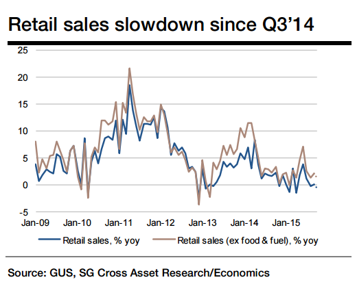 Poland's retail sales growth is expected to have decreased to -0.7% in October from 0.1% in September compared with a mom increase of 3.4%. Retail sales were mainly driven by car sales (8.1% yoy), textile, clothing and footwear (11.9% yoy) and press & other sales in specialised stores (13.4% yoy).