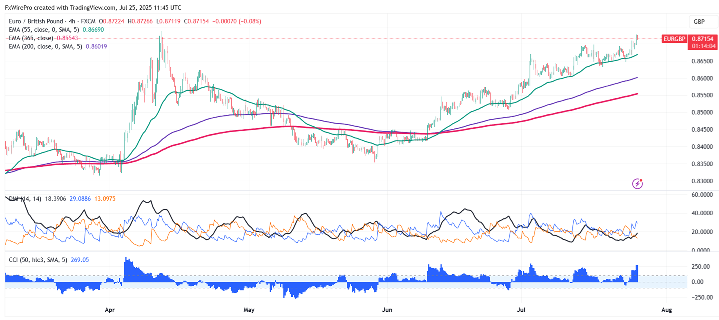 EURGBP holds above 0.8700 on policy divergence between the ECB and the BOE. Intraday bias remains bullish as long as support 0.8640 holds. It hits an intraday high of 0.87270 and is currently trading around 0.87146.