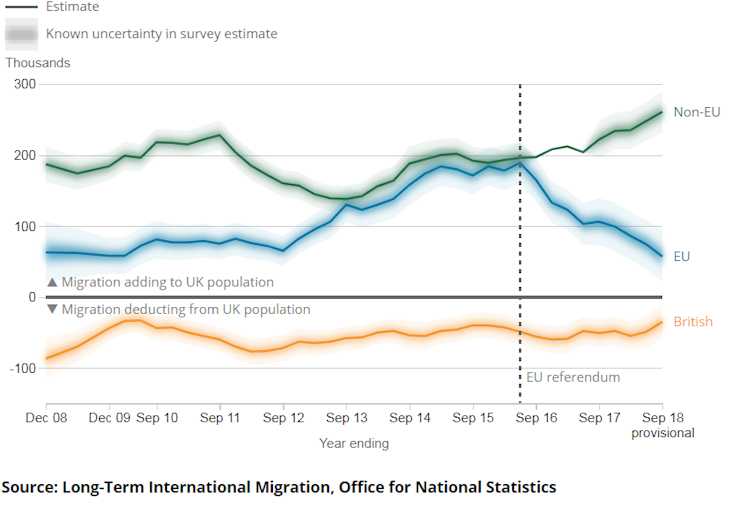 The perspective of migrants is especially important towhen it comes to understanding the likely impact of the end of free movement. Since the 2016 EU referendum, net migration has fallen to levels last seen in 2009, yet the UK hasn’t even left the EU yet. The detail of immigration policy is less important than the central message that free movement is ending – at an as-yet unspecified date. Current trends and the complexity of new proposed visa arrangements make it almost inevitable that the UK will become a less popular destination for EU citizens.