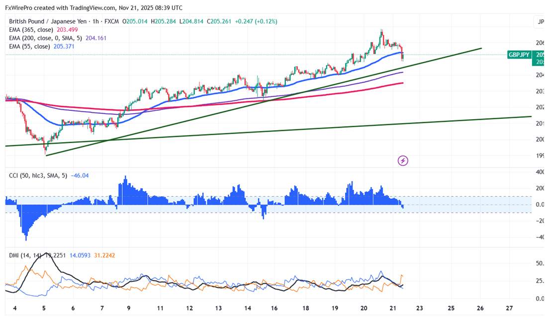 GBPJPY trades weakly as yen recovers. Intraday trend is bearish as long as the resistance at 206.25 holds. It hit a low of 205.13 at the time of writing and is currently trading around 205.15.
