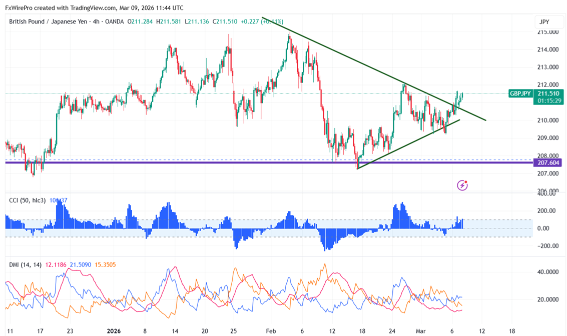 With board-based yen selling, GBPJPY rose over 211.50. Having reached an intraday high of 211.58, it is presently trading around 211.52.