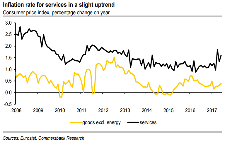 "We still assume that the core rate of inflation will only exceed 1% sustainably in 2018. This argues against an imminent ECB rate hike, especially with inflation expectations likely to remain low in view of the progressive decline of the headline rate of inflation to 1.3%," said Commerzbank in a report.
