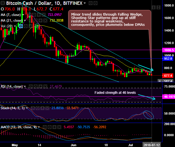 - The price of BCHUSD pair is experiencing a major bearish trend. The minor trend of BCHUSD slides through falling wedge formation (refer daily chart).