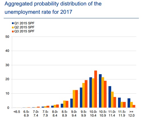 The above chart shows, unemployment is unlikely to decrease much by 2017. Probability distribution of the unemployment shows it is most likely to stay around 10%.