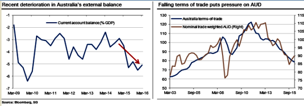 The Australian terms of trade are still falling, and thus the fundamental path of least resistance for AUD is for further depreciation (see above graph). This, plus the persistent and surprising disinflationary pressures in Australia, has kept the RBA on an easing bias, with one rate cut expected in H2 16.