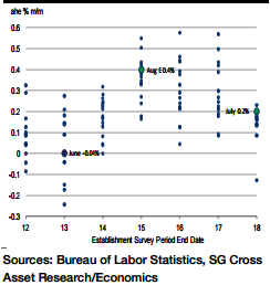 "Double the current median Street projection is forecasted and would push the year-to-year growth of the closely followed nominal compensation measure one tick higher to 2.2% - the upper end of the prevailing range over the past 12 months", says Societe Generale.