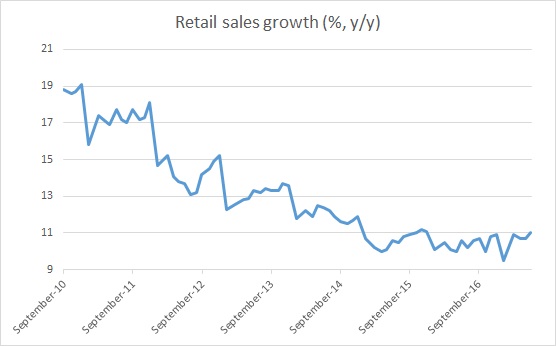 - Retail sales grew by 11 percent in June from a year ago, which is the highest pace of growth since December 2015.