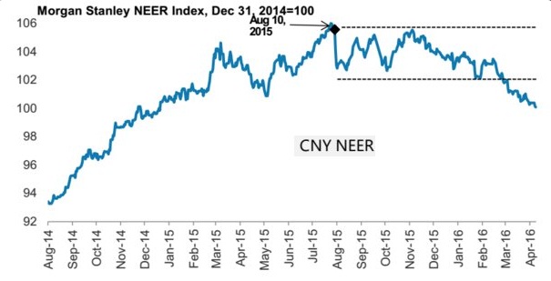 On a trade weighted basis, Yuan reached peak in August last year, according to Morgan Stanley’s NEER index and has been depreciating steadily since November and that trend hasn’t reversed yet. Yen may have reached some stability against Dollar but that is largely due to weakness in Dollar, rather than strength in Yuan.