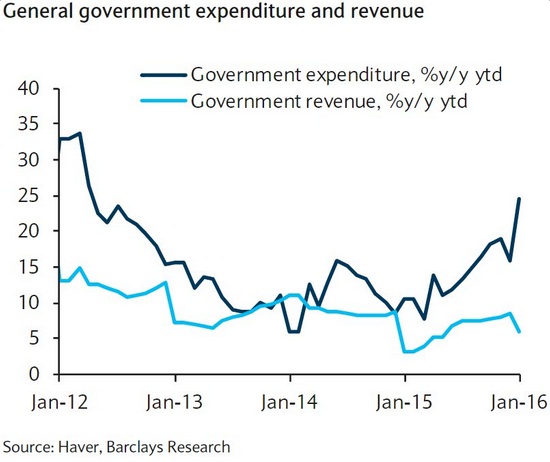 Increase in government expenditure in China after reaching as much as 35% y/y in early January has been dropping steadily and bottomed around 5% back in 2014. But since last year it has started growing steadily and in 2016 it has jumped sharply and now gaining at a pace close to 25% y/y.