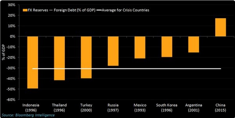 This fantastic figure from Bloomberg chief economist, Asia, Tom Orlik best explains why China not likely to face a currency crisis. FX reserve - foreign debt as a percentage of GDP has been negative 30% for countries that has suffered currency crisis in the past. For Indonesia, it was around -50% back in 1996. Compared to all that China's ratio stands at close to positive 20%.