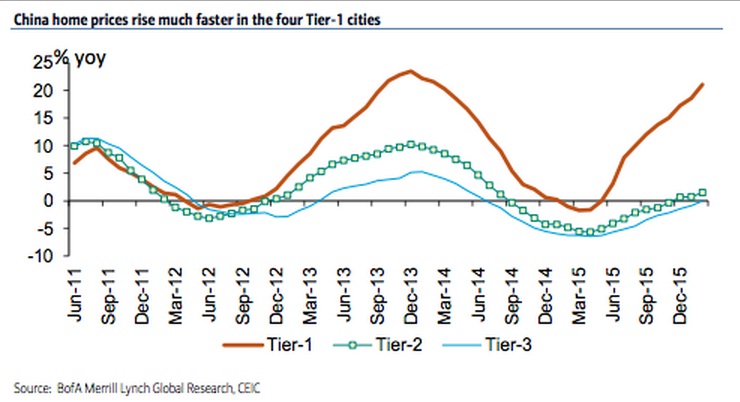 - Compared to the above figure, prices were up just 1.5% in Tier-II cities and prices actually dropped by -0.1% in Tier-III/IV cities. Latest chart from Bank of America Merrill Lynch (BofAML) shows the disparity in the housing market.