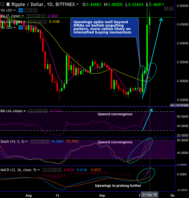 XRP/USD: After streaks of bullish rallies that have now gone well beyond 21DMAs upon back-to-back hammer and stern bullish engulfing candlestick patterns, the uptrend now continues to show bullish rout, currently surging above 0.47117 levels (refer daily chart).