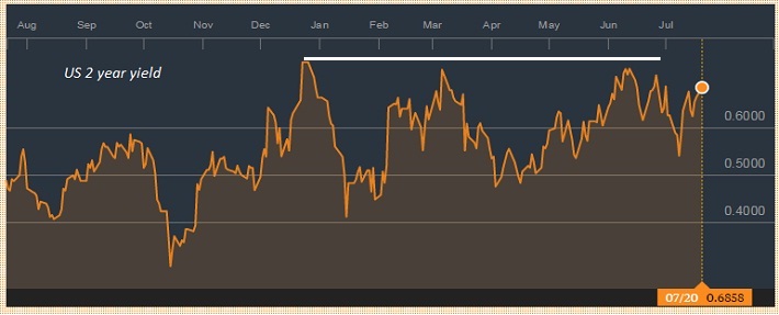 - US 2 year treasury yield is currently at 0.6817, up 2.43% today so far. While rising yield supports dollar, key question remains, whether or not yield will be able to break out its resistance around 0.73-0.75% area.