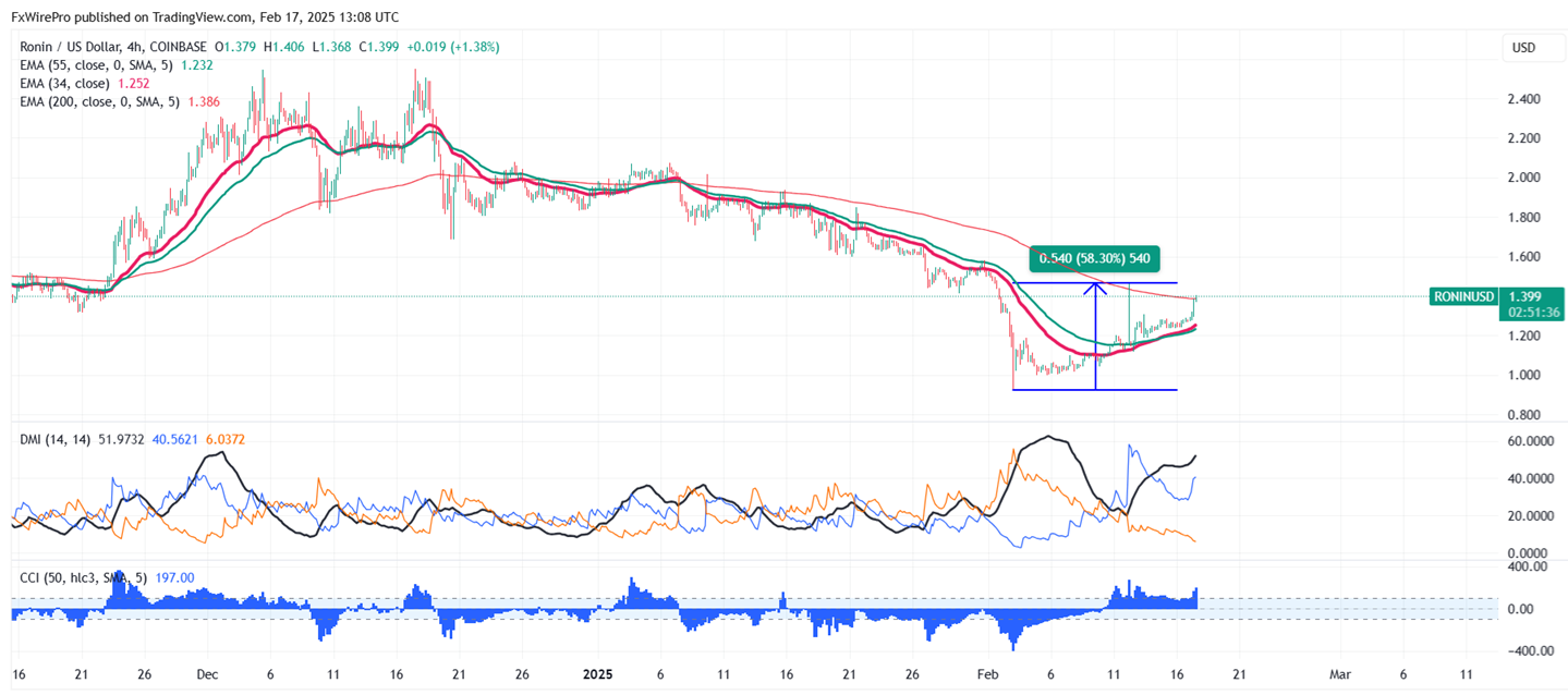 RONUSD trades higher and surged more than 55% in the past two weeks after a massive sell-off. The pair holds well above the short-term (21 and 55 EMA) and long-term moving average. It hit a high of $0.21047 and is currently trading around $0.2100.