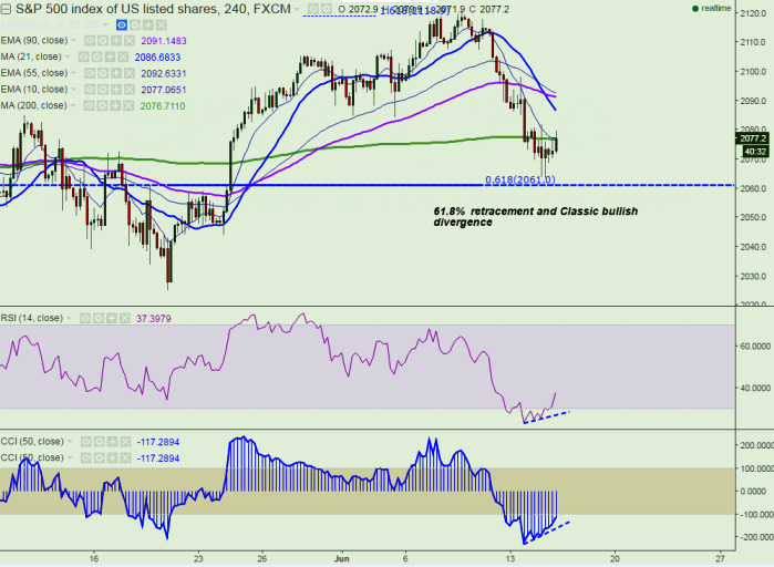 - S&P500 has recovered after making a low of 2063.70.it is currently trading around 2078. Short term trend is lightly bullish as long as support 2060 holds.