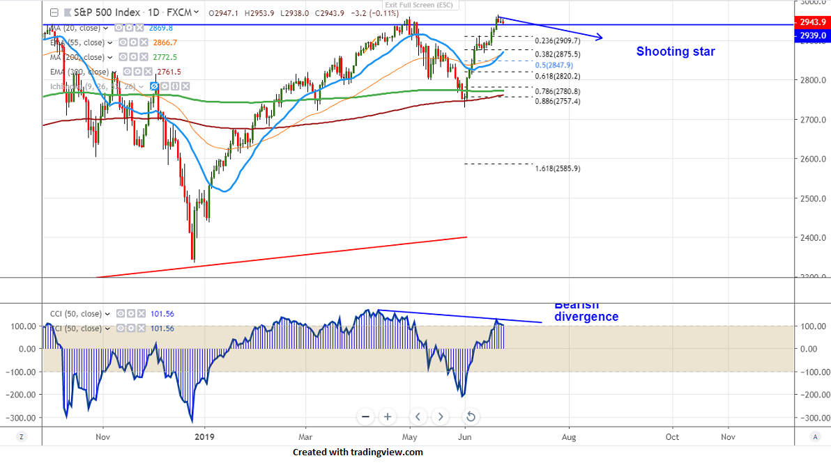 S&P500 has halted its 15-day bullishness and shown a minor decline. The index hits all-time high and jumped more than 200 points from low of 2728 made on Jun 3rd 2019. The jump was due to a slight easing of trade war tension between the US and China. It hits intraday low of 2938 and is currently trading around 2943.